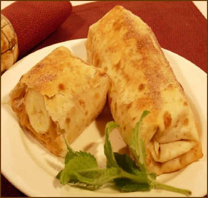 Spread Grainstore wrap with peanut butter place I/2 banana in middle of wrap fold in left and right sides in and roll up wrap.